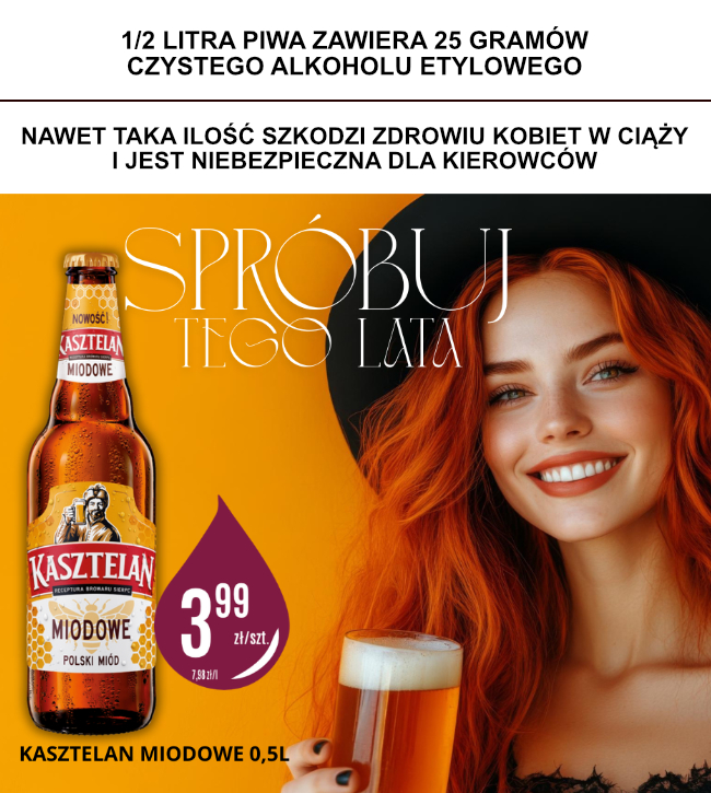 2025-08-062025-08-05Promocje Kasztelan Miodowe Spróbuj tego lata!Kasztelan Miodowe – delikatne, złociste piwo z nutą miodu.Idealne na letnie wieczory, spotkania i chwile relaksu. Smak, który pasuje do wakacyjnego nastroju! 🍺 Pamiętaj, aby pić odpowiedzialnie. Alkohol tylko dla pełnoletnich.